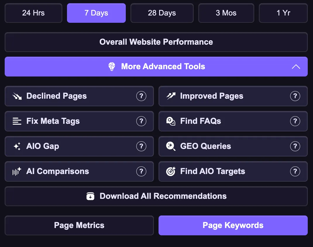 Explore all the GSC data, including clicks, impressions, keywords, AIO opportunities, and other metrics directly in the Chrome extension.